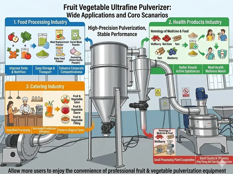 Fruit Vegetable Ultrafine Pulverizer, jolla on erittäin tarkka murskausetu ja vakaa suorituskyky, on laajalti käytössä useilla aloilla. Ydinsovellusskenaariot ovat seuraavat: