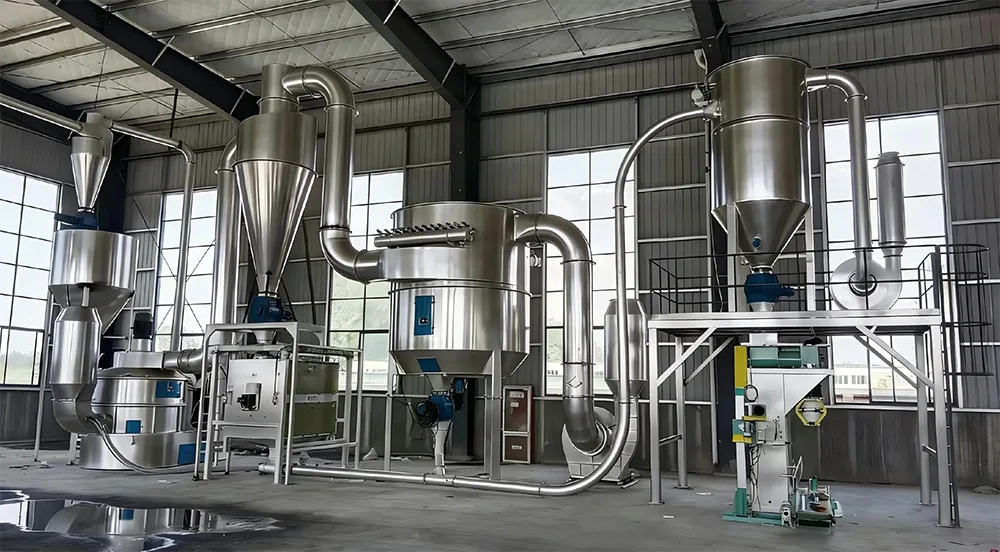 Tämä malli on peräisin Xingshengwein vuosien teknisestä kertymisestä korkeaöljyisten materiaalien käsittelyssä; Sitten tulee lajitteluvaihe, jossa laitteistoon rakennettu nopea lajittelupyörä tasapainottaa tarkasti keskipakovoiman ja ilmavirtausvoiman valitakseen vaatimukset täyttävän laadukkaan hienojauheen. Karkeat hiukkaset, jotka eivät täytä standardeja, virtaavat automaattisesti takaisin murskausalueelle toissijaista käsittelyä varten, mikä varmistaa, että tuotetun jauheen hiukkaskoko on tasainen ja johdonmukainen ja että luokittelutarkkuus täyttää Xingshengwein tiukat tuotantostandardit; Lopuksi keräysvaiheessa hyväksytty maapähkinäjauhe tulee syklonikerääjään ilmavirran mukana erottamisen ja keräämisen suorittamiseksi loppuun. Yhteensopiva pulssipussipölynkerääjä voi saavuttaa mikrojauheen talteenoton ja pakokaasun puhdistuksen ilman pölyvuotoja tai materiaalihävikkiä koko prosessin aikana. Se on sekä ympäristöystävällinen että voi parantaa raaka-aineiden käyttöä, mikä osoittaa Xingshengwein vihreän tuotantokonseptin.