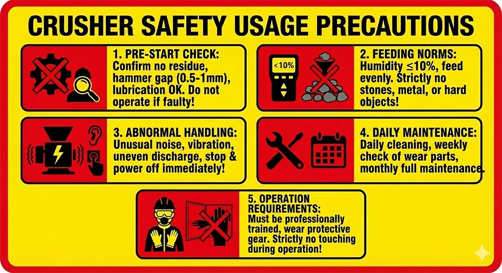 Poikkeuskäsittely: Laitteen ollessa käynnissä, jos siitä kuuluu outoja ääniä, voimakasta tärinää tai eripaksuisia murskattuja materiaaleja, se tulee pysäyttää välittömästi ja katkaista virta. Tarkista ensin, onko vasara kulunut tai onko tasoituspyörä tukossa. Kun ongelma on ratkaistu, käynnistä kone uudelleen.